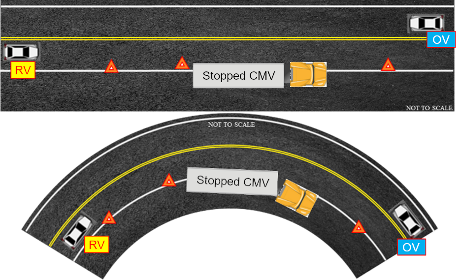 Parked or disabled commercial motor vehicles (PDCMVs) on the road negatively impact traffic operations and safety1. To increase the conspicuity of PDCMVs and mitigate crash risk, Federal Motor Carrier Safety Administration (FMCSA) requires specific warning devices to be carried2 on all commercial motor vehicles (CMVs) and, except in the case of necessary traffic stops, be deployed3 near the vehicle whenever it is stopped on the road or shoulder. The Federal Motor Carrier Safety Regulations (FMCSRs) prescribe specific rules4 concerning how and where the warning devices must be placed, based on road and traffic attributes (e.g., whether the road is straight or curved, whether the vehicle is stopped in a business or residential district, whether the road is divided or undivided, etc.) as well as the presence of conditions affecting visibility (e.g., time of day, physical obstructions, etc.). These requirements follow from the basic notion that increasing the conspicuity of a PDCMV makes it easier to see and recognize, thereby reducing the risk of a crash involving passing motorists.