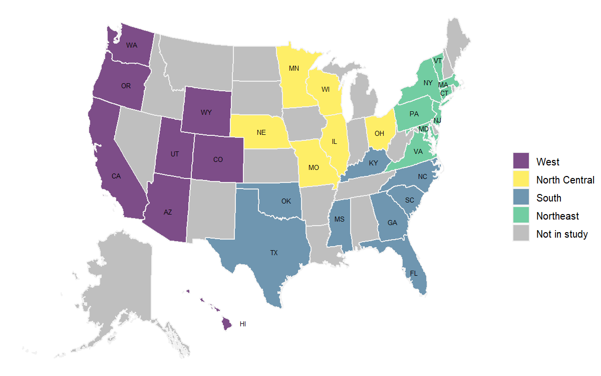 West (Alaska, Arizona, California, Colorado, Hawaii, Idaho, Montana, New Mexico, Nevada, Oregon, Utah, Washington, Wyoming)