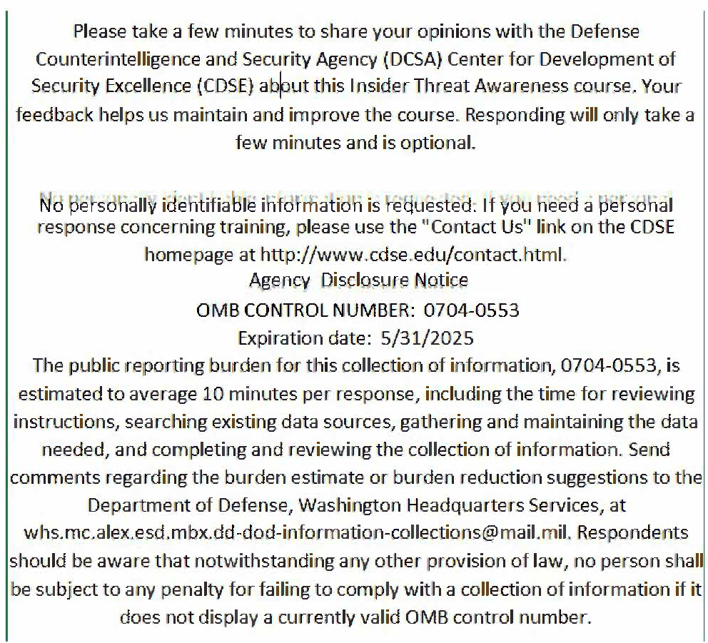https://survey.foreseeresults.com/survey/display?cid=FJo99FIhUB5oc1gZdcI5sA4C&sid=sl-cdse-insider-threat-awareness-en&cpp[CourseID]=INT101&cpp[SP]=GEN