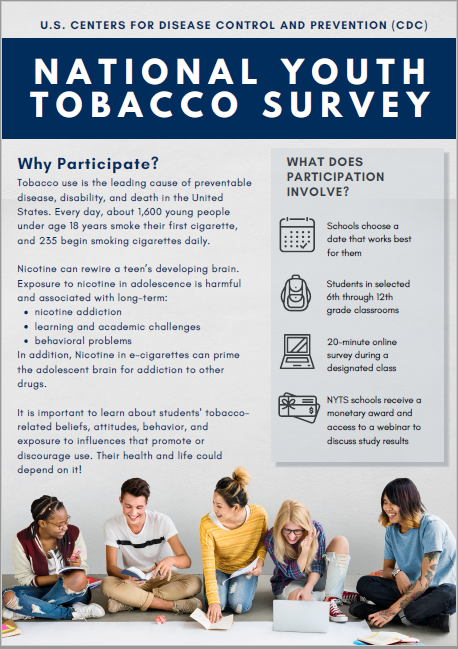 Your school has been selected to participate in the 2024 National Youth Tobacco Survey (NYTS), sponsored by the U.S. Centers for Disease Control and Prevention (CDC). The NYTS, which has been conducted since 1999, provides important information about students’ knowledge of and attitudes towards tobacco, their exposure to secondhand smoke, and their exposure to influences that promote or discourage tobacco use.