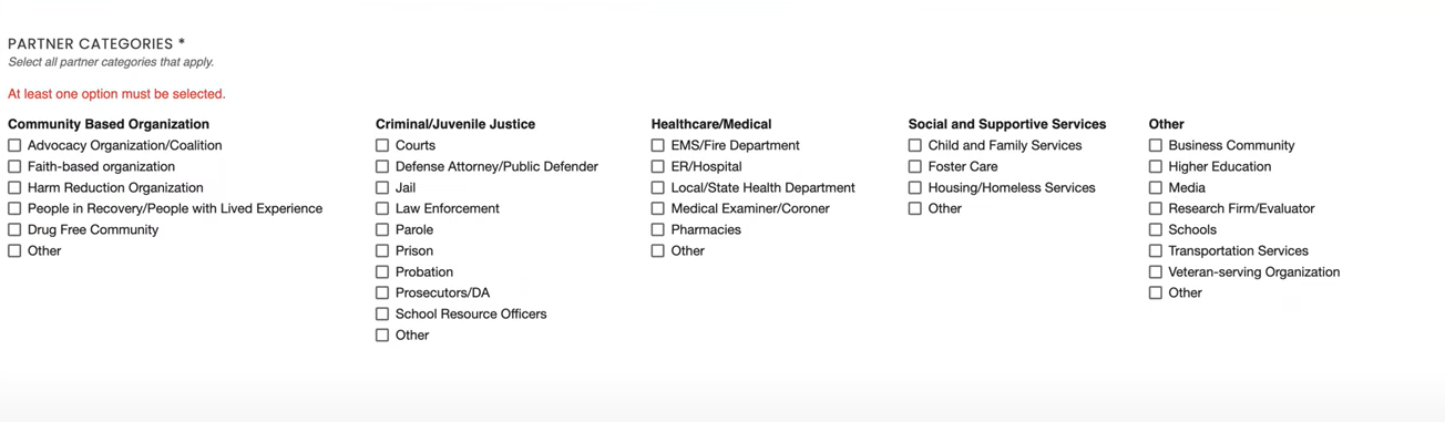 ✔ At least one category must be selected. If “other” is selected, a description must be provided. |