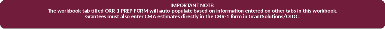 The ORR-1 CMA Budget Estimate and Justification has two parts: 1) the ORR-1 form to report CMA estimates by program component and administrative costs for the FY; and 2) this document, the ORR-1 Instructions and Budget Workbook, to help you develop and justify your budget estimate for that ORR-1 form. The workbook includes the following: