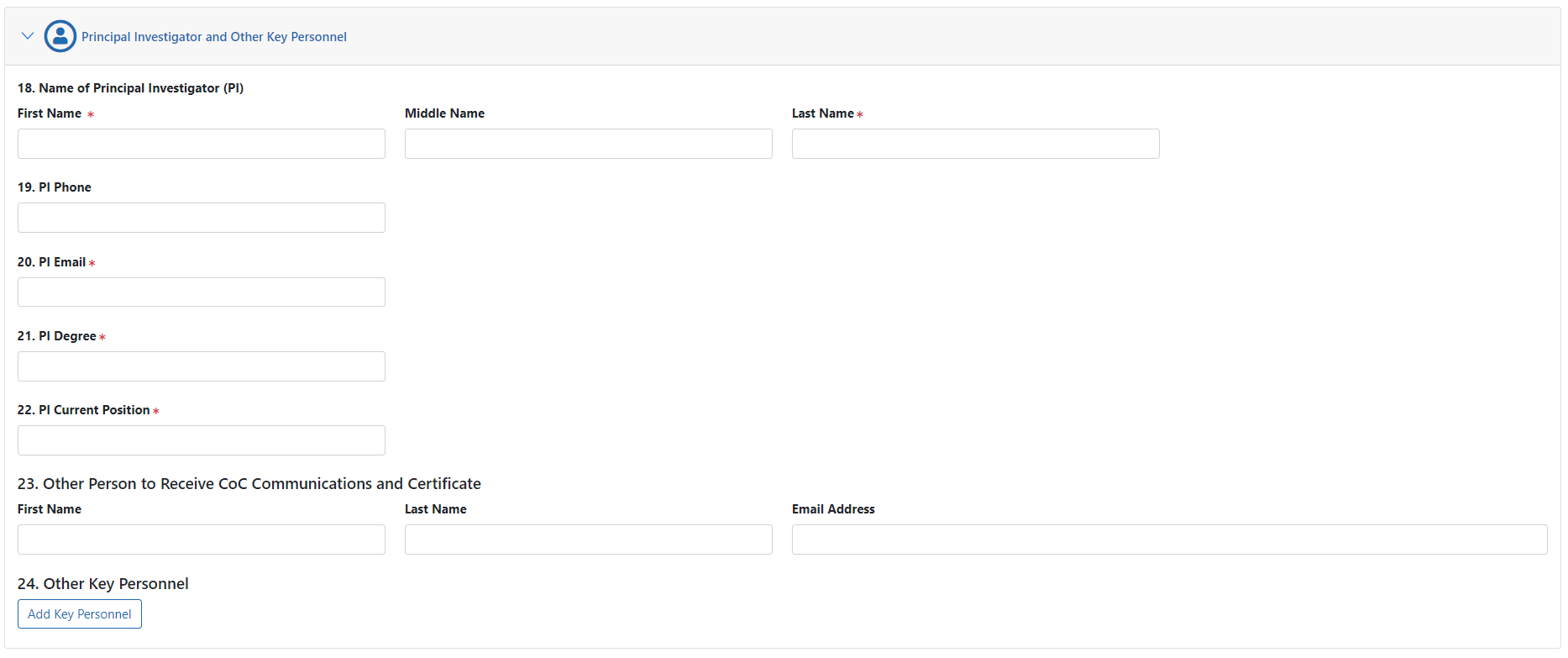 User Interface: Certification, Questions 18-24, Principal Investigator and Other Key Personnel