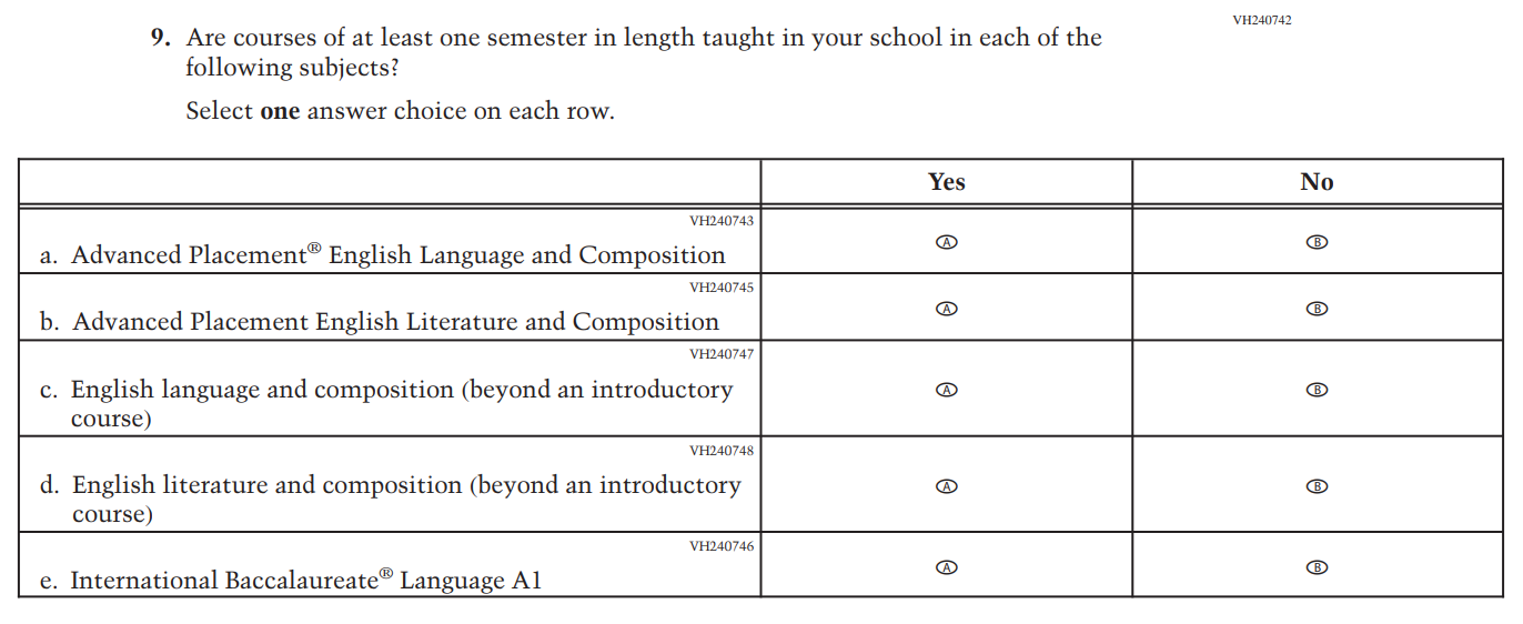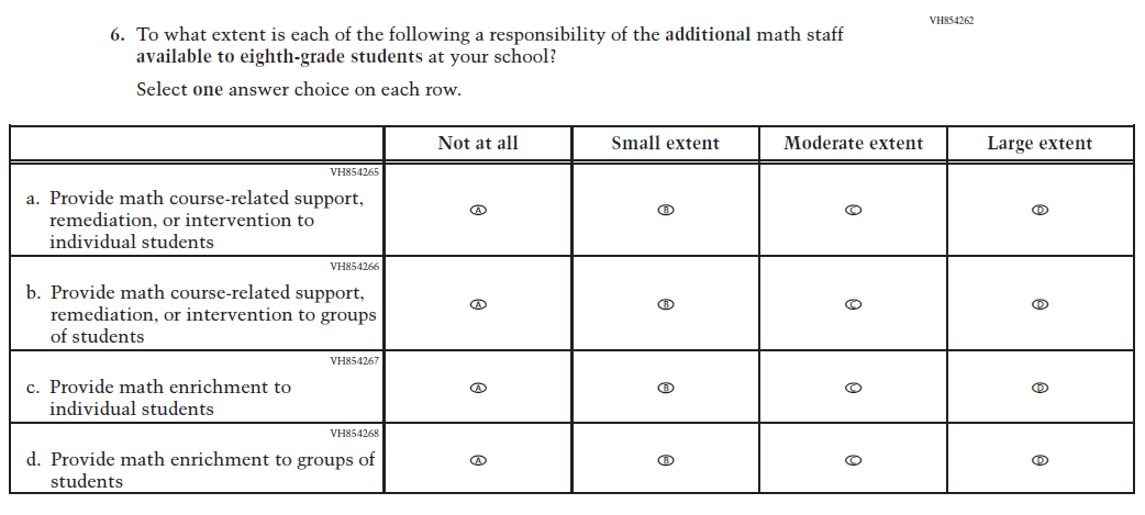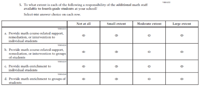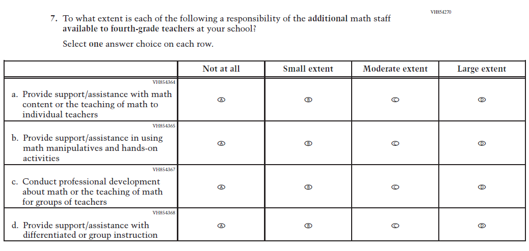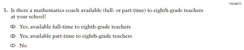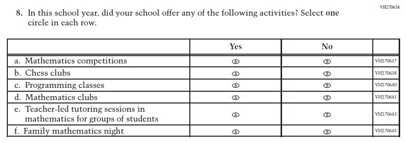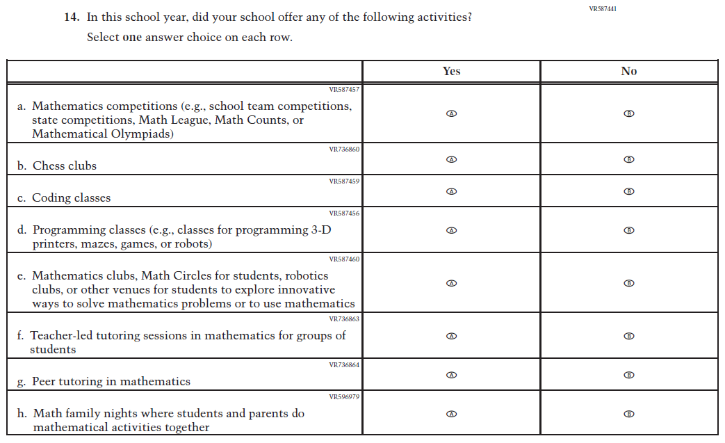 For 2026, we have aligned Inline Directions in Teacher and School Items with the Directions currently used in Student Items. Subitems a, c, and d were revised for clarity, and new subitems c and g were added to capture activities related with mathematics offered by schools. |