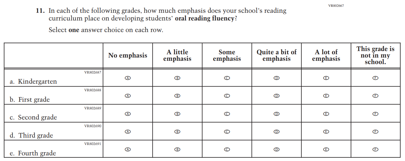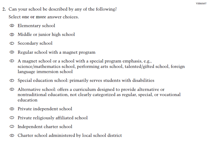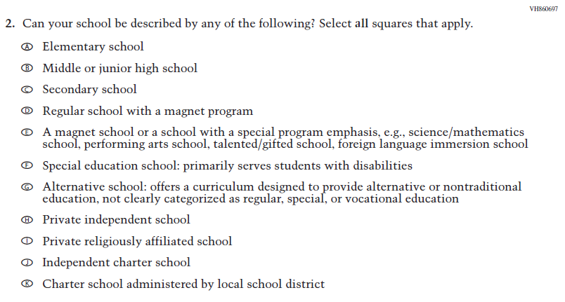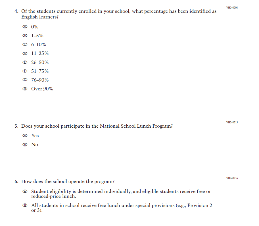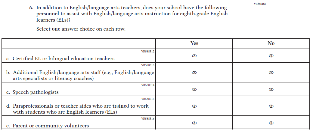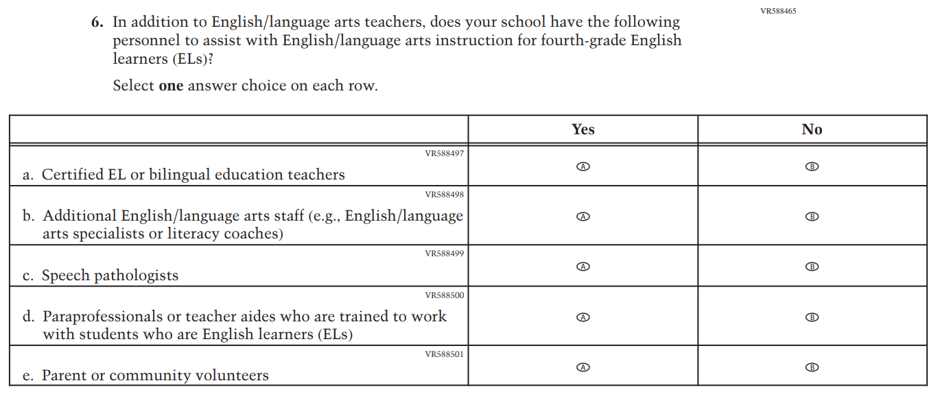 For 2026, we have aligned Inline Directions in Teacher and School Items with the Directions currently used in Student Items. Also, in SubItem g. “English-language learners” was updated to “English learners” to be consistent with other Items. |