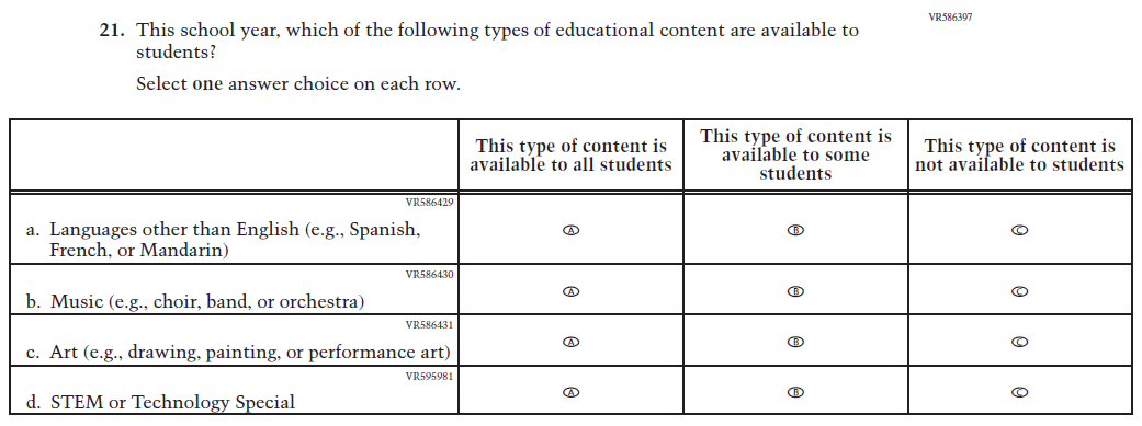 This Item was developed to measure students’ learning environments and access to educational content focused on languages, music, art, and STEM. |