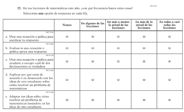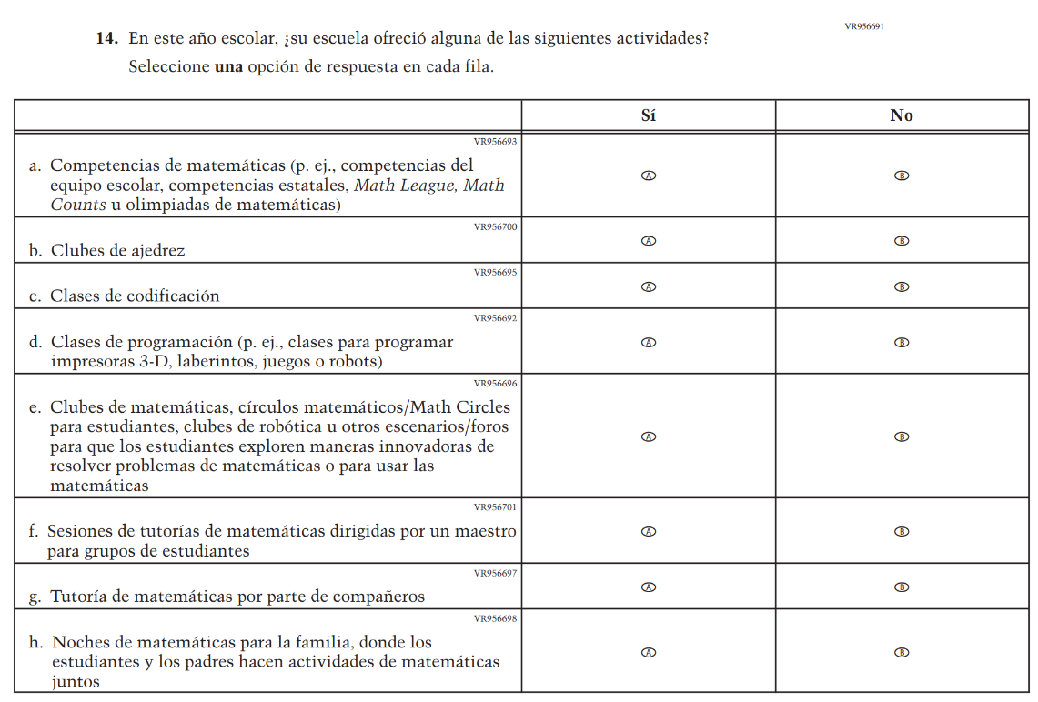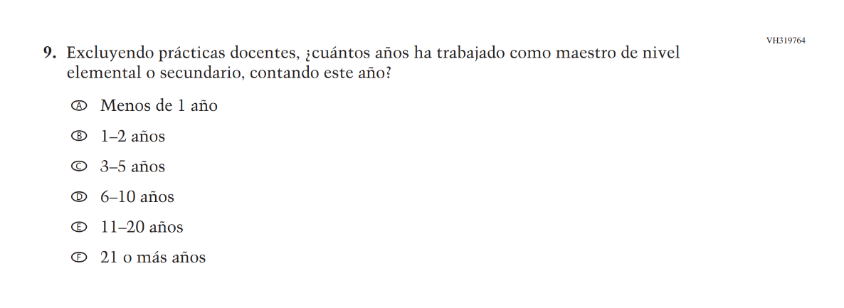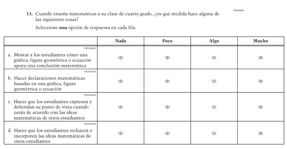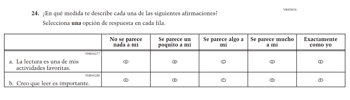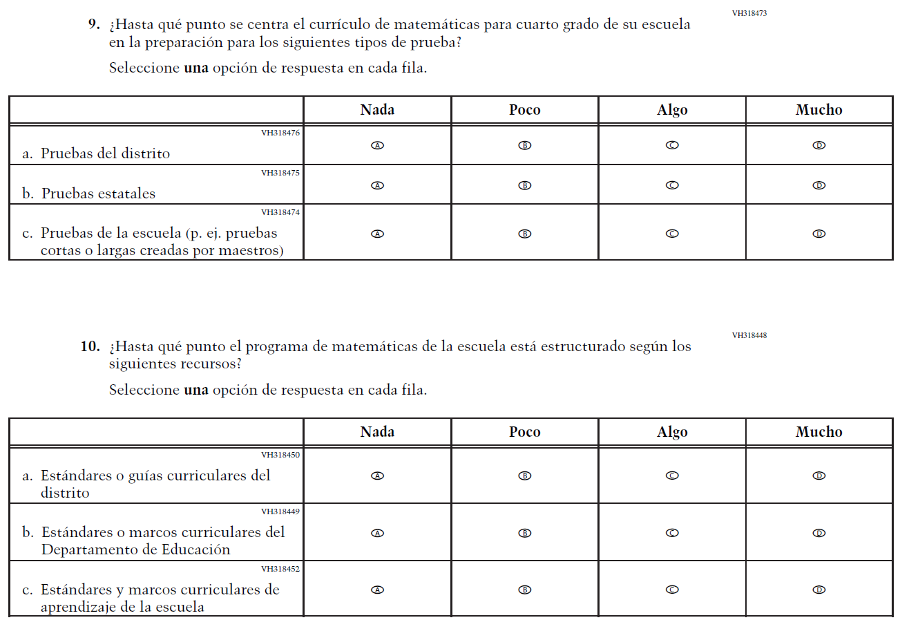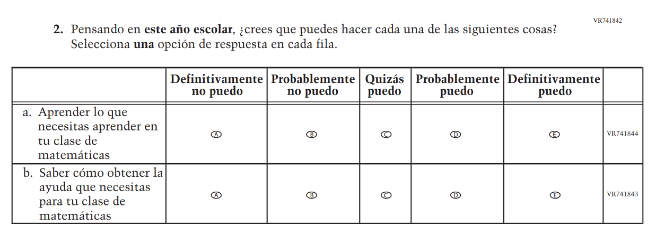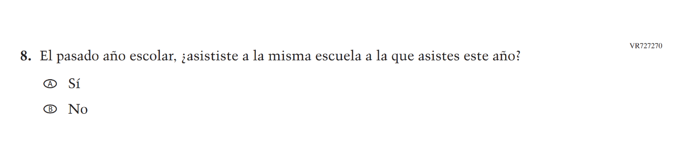 Appendix J-S provides Operational and Pilot Spanish student, teacher, and school survey questionnaires that will be administered in 2026. Summary tables reflect any changes to the items from the 2024 administration. Please note, some of the numbers of the items may be missing or out of order in these printed versions. This will be corrected in the platform view.