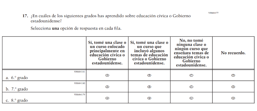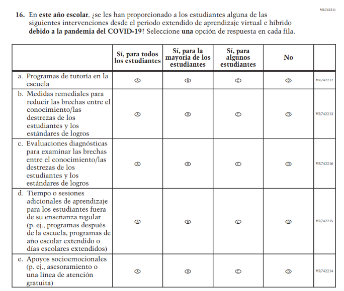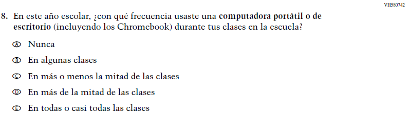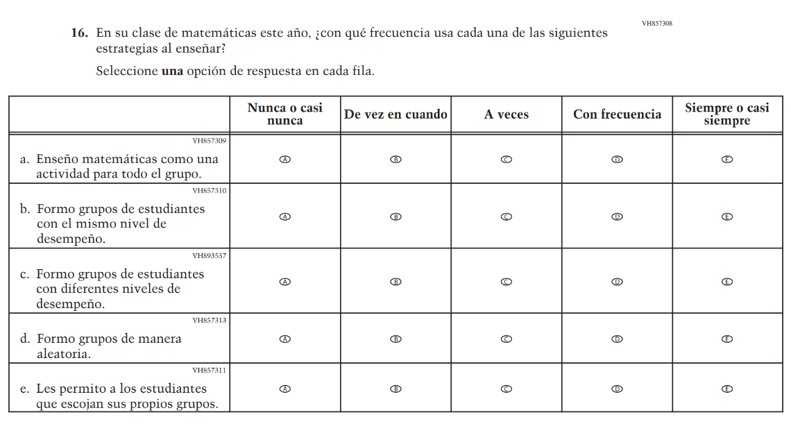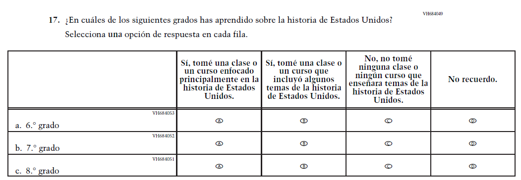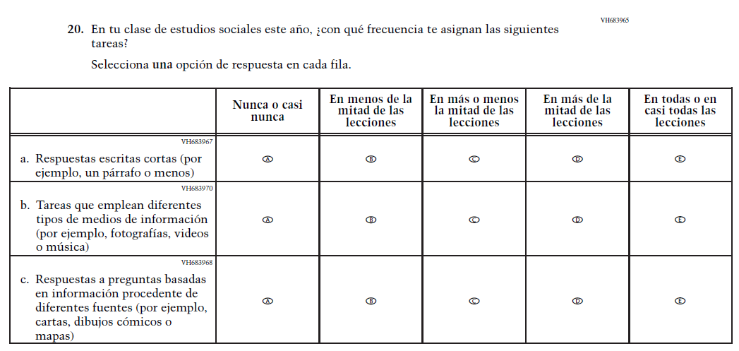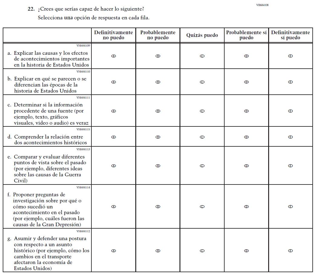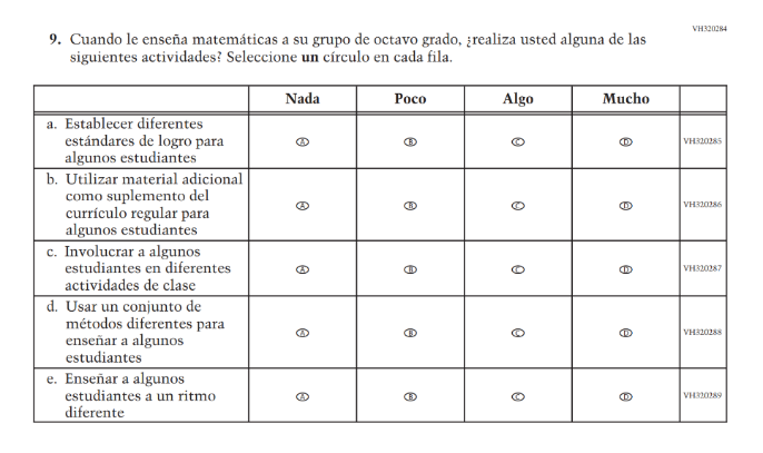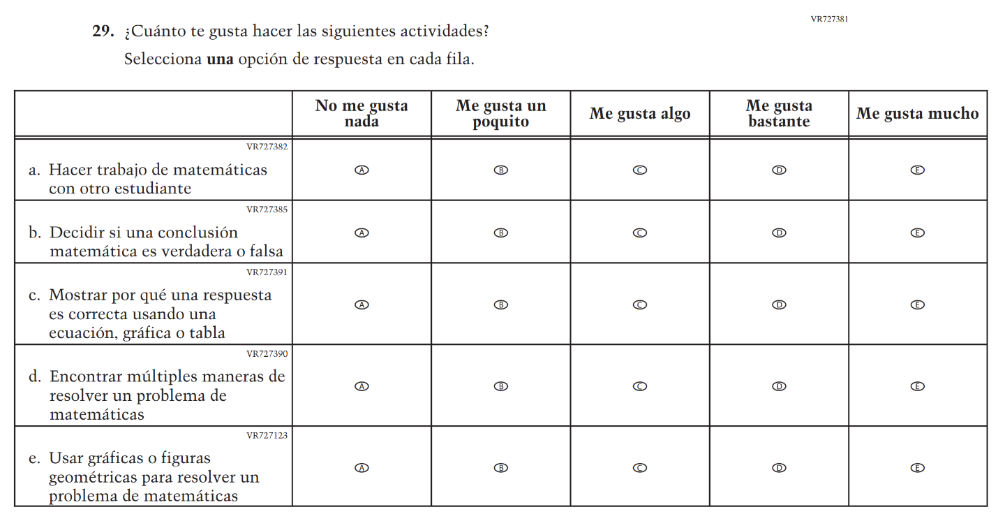 Appendix J-S provides Operational and Pilot Spanish student, teacher, and school survey questionnaires that will be administered in 2026. Summary tables reflect any changes to the items from the 2024 administration. Please note, some of the numbers of the items may be missing or out of order in these printed versions. This will be corrected in the platform view.