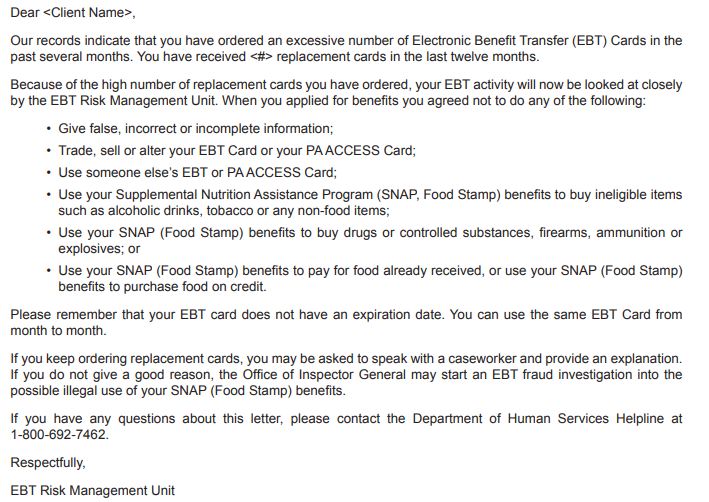 (IF NOT ALREADY DISCUSSED) This letter talks about asking for an excessive number of EBT cards. In your own words, what does that mean to you?
