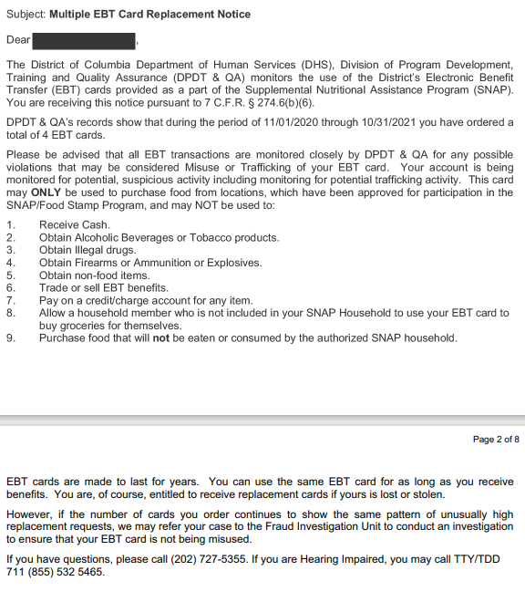 Do you recall ever hearing anything about someone asking for too many replacement EBT cards? If so, what do you remember about that?