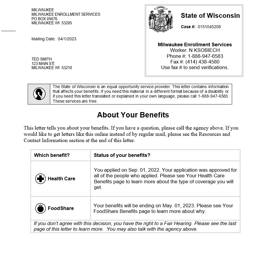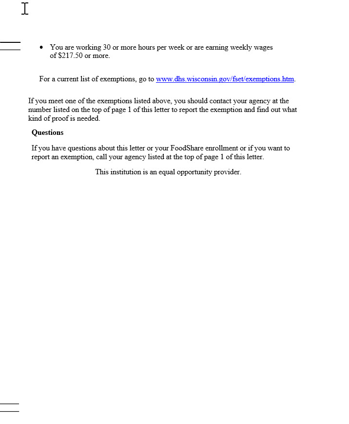 Here is a letter that someone receiving FoodShare benefits might receive. Please take a few minutes to read the letter and then we will talk about it. If needed: Please remember to say what comes to mind as you are reading.