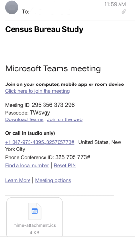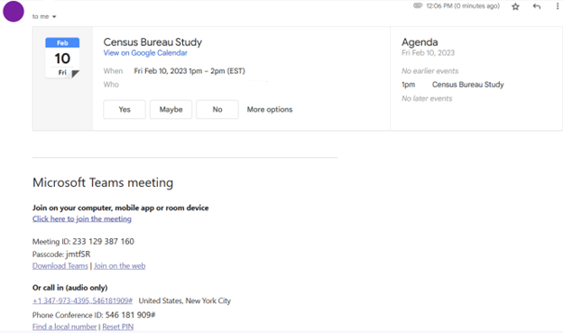 You will receive an invitation that looks like this. Click the “Click here to join the meeting” when it’s time during the study.