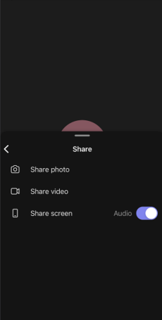 7. Click the “Share” button. Then click “Share screen” and make sure “Audio” is toggled on.