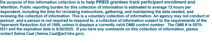 The purpose of this information collection is to help PREIS grantees develop data analysis plans. Public reporting burden for this collection of information is estimated to average 12 hours per respondent, including the time for reviewing instructions, gathering, and maintaining the data needed, and reviewing the collection of information. This is a voluntary collection of information. An agency may not conduct or sponsor, and a person is not required to respond to, a collection of information subject to the requirements of the Paperwork Reduction Act of 1995, unless it displays a currently valid OMB control number. The OMB # is 0970-0531 and the expiration date is 9/30/2025. If you have any comments on this collection of information, please contact Selma Caal ([email protected]). | ||||||||