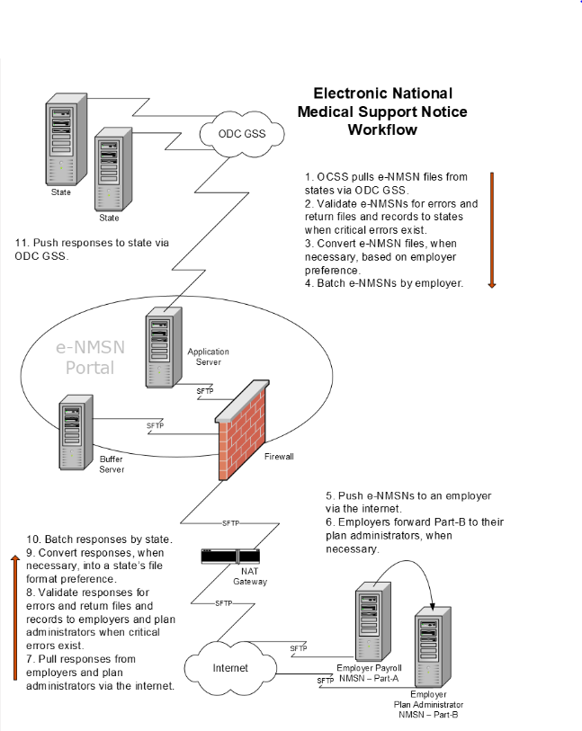 The Child Support Portal houses the e‑NMSN system. The system is capable of transmitting standard, fixed-length files between states, employers, third-party providers, and plan administrators.