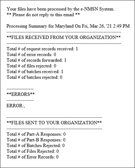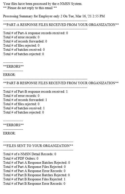 After file processing, the e‑NMSN system emails a processing summary and any errors to the state, employer, or plan administrator.