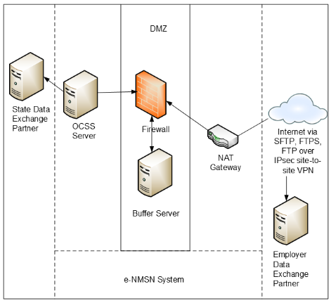 States connect to the OCSS network through Internet Protocol Security (IPsec) site-to-site Virtual Private Networks (VPNs). States exchange e‑NMSN data through this connection to a Secure File Transfer Protocol (SFTP) or File Transfer Protocol Secure (FTPS) server at the state. An IPsec site-to-site VPN must be established between OCSS and the state.