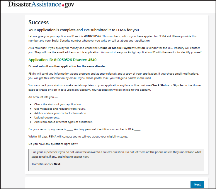 Let me give you your application ID — it is #XXXXXXXXX. This number confirms you have applied for FEMA aid. Please provide this number and your Social Security number whenever you write or call us about your application.