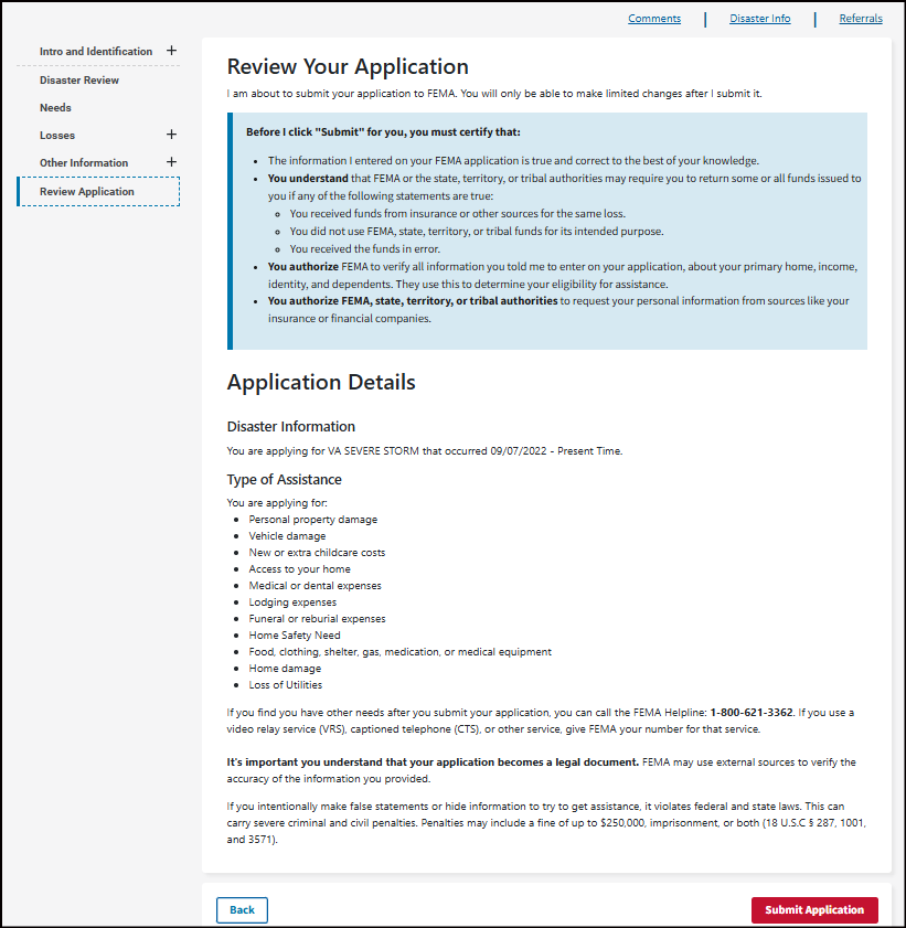 It's important you understand that your application becomes a legal document. FEMA may use external sources to verify the accuracy of the information you provided.