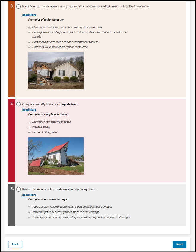 Select what caused your damage. FEMA uses this information to better understand the extent of damage in a community and any damage that needs to be reviewed by your insurance company first.