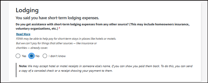 Other Needs Assistance - This can help with some immediate needs when you can't live in your home. It may cover certain losses and expenses caused by the disaster. Things like personal property and vehicle losses; medical, dental, child care, moving and storage, and funeral expenses."