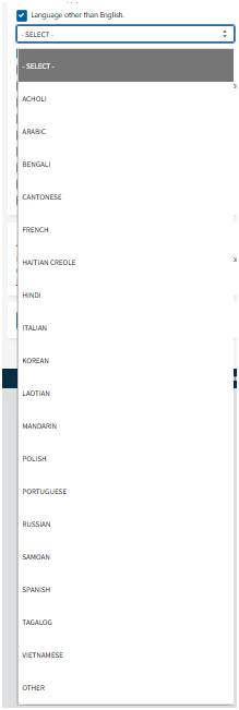 Acholi/Arabic/Bengali/Cantonese/French/Haitian/Creole/Hindi/Italian/Korean/Laotian/Mandarin/Polish/Portuguese/Russian/Samoan/Spanish/Tagalog/Vietnamese/Other