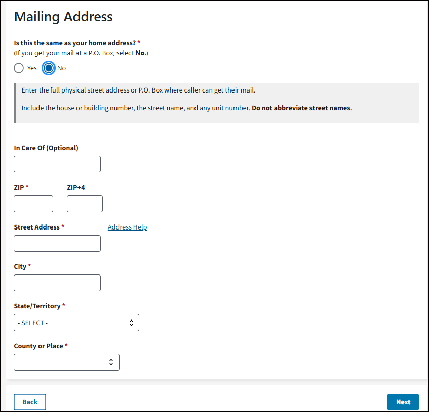 Include the house or building number, the street name, and any unit number. Do not abbreviate street names or enter a P.O. Box.