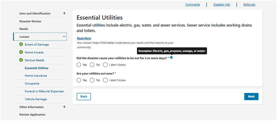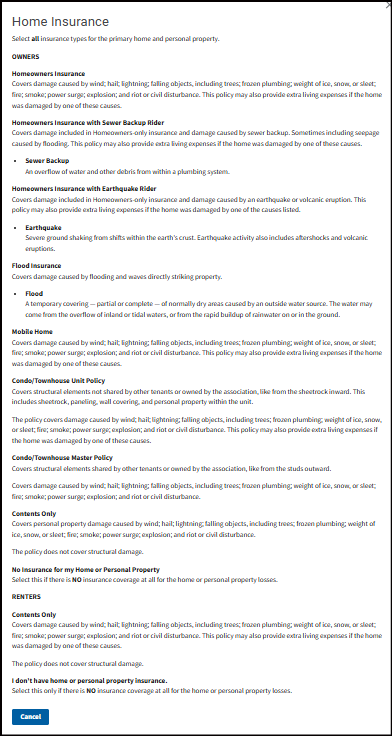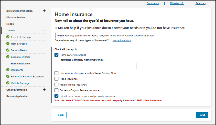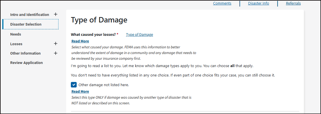 Select what caused your damage. FEMA uses this information to better understand the extent of damage in a community and any damage that needs to be reviewed by your insurance company first.