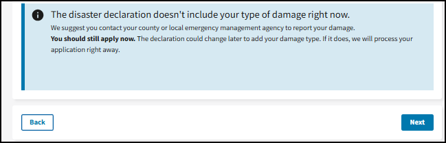 "Which disaster do you need help with, and where did your damage happen?"