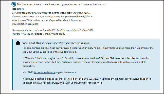 If the caller has business needs ONLY — like business property damage or economic losses caused by the disaster — refer them to the Small Business Administration (lending.sba.gov). SBA offers low-interest disaster loans for home, personal property (including for renters), and business losses.