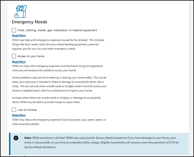 Select what caused your damage. FEMA uses this information to better understand the extent of damage in a community and any damage that needs to be reviewed by your insurance company first.