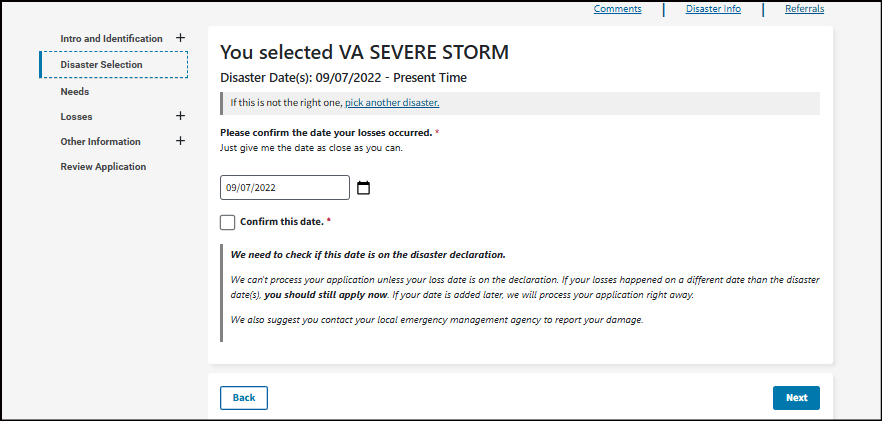 You are applying for VA SEVERE STORM that occurred 09/07/2022 - Present Time.