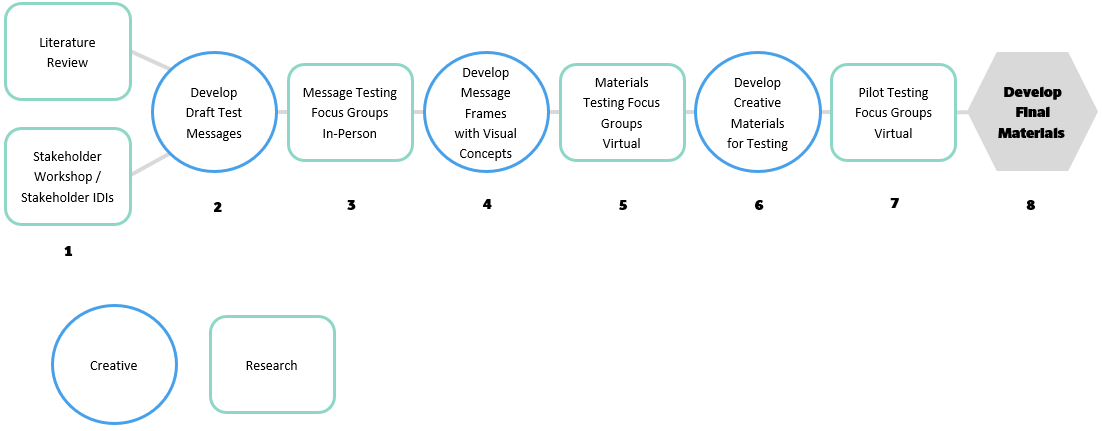 The Office of People Analytics (OPA) will use this information collection effort to test messages and materials (e.g., posters, digital assets for sharing on social media) for a social marketing campaign by conducting in-person and virtual focus groups with the target audience for the campaign (Service members who are men). We will use an iterative approach, as shown in Figure 1 below, to develop, test, and disseminate campaign materials. More specifically, we will conduct up to 76 90-minute focus groups at up to 18 CONUS installations over the course of three discrete phases (steps 3, 5, and 7 in Figure 1) to iteratively test and refine creative concepts and materials. The first phase of focus groups will be conducted in person on military installations. The second and third phases of focus groups will be conducted virtually using zoom.gov.