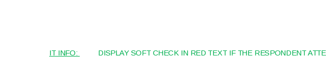 IT INFO: DISPLAY SOFT CHECK IN RED TEXT IF THE RESPONDENT ATTEMPTS TO ADVANCE SCREEN WITHOUT RESPONDING: “Please answer as best you can.”