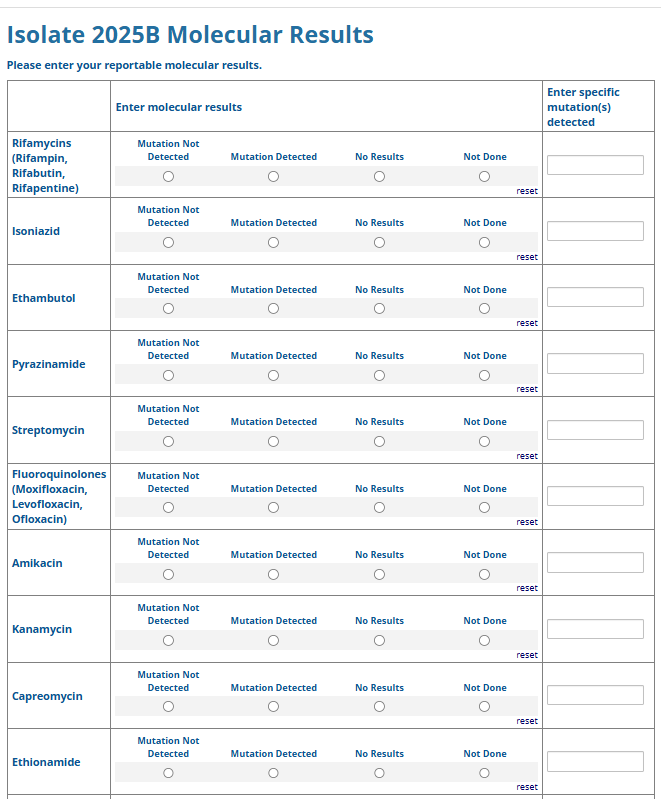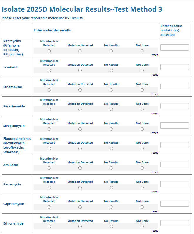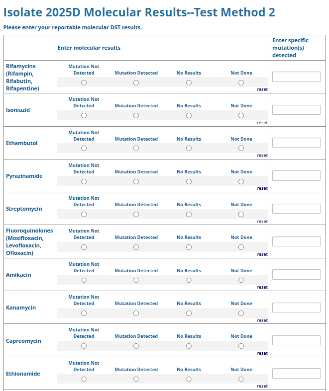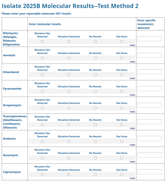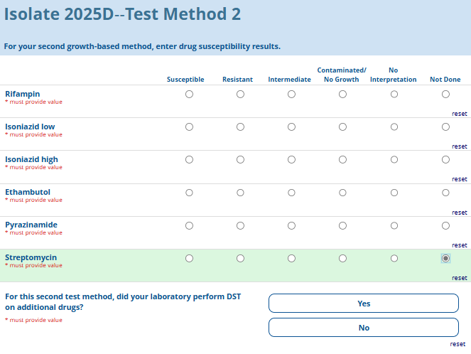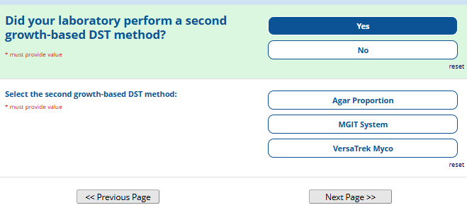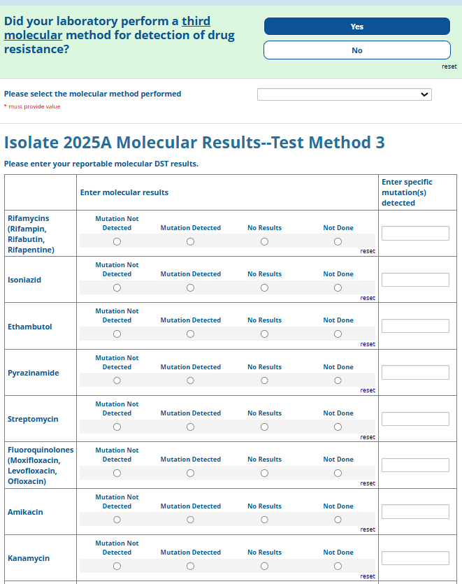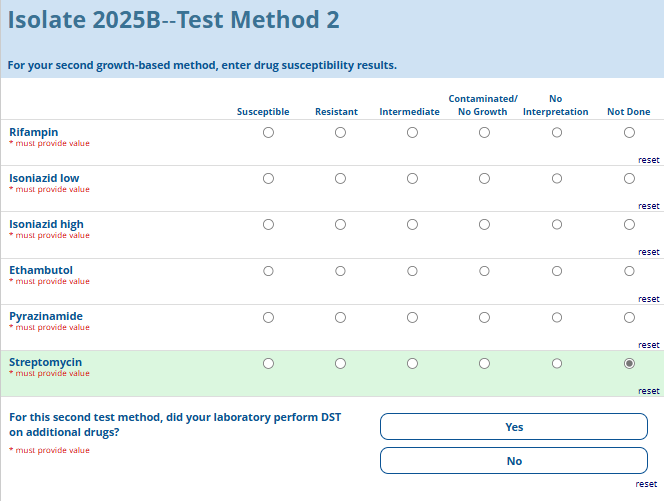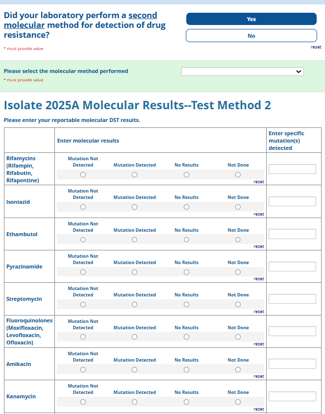 Respondents are able to submit up to two growth-based drug susceptibility testing (DST) methods and results and three molecular testing methods and results. The data collection instrument is built to include logic (a survey tool that allows a tailored question path based on respondents’ answers) to reduce burden for participating laboratories or respondents who only perform one DST method. This logic includes asking whether growth-based DST was performed (if the answer is yes, then a question is asked to determine whether a second growth-based method was performed) and whether molecular testing for drug resistance was performed (if the answer is yes, then questions are asked to determine whether a second and third molecular method was performed).