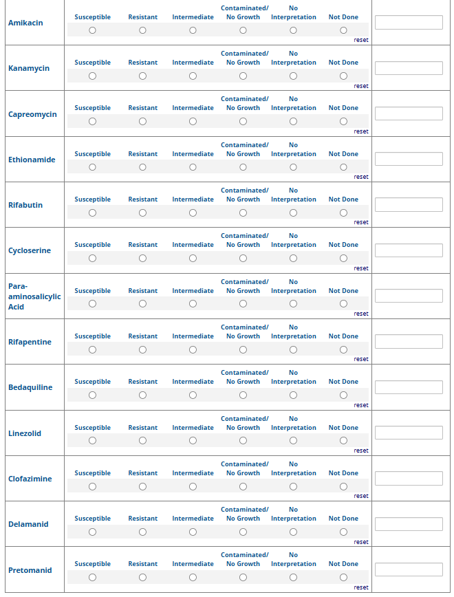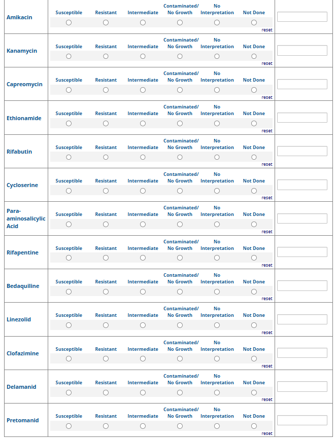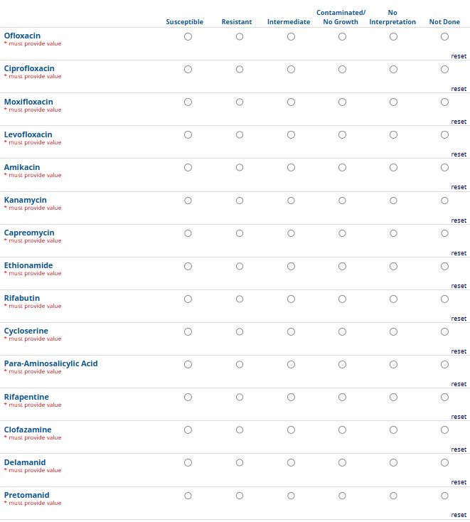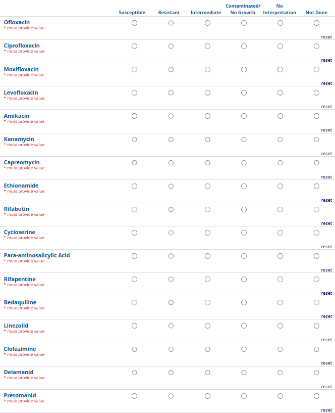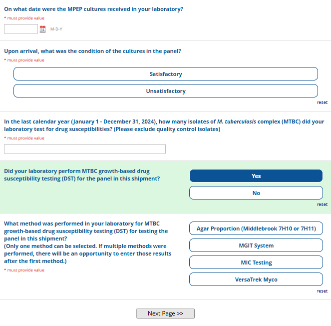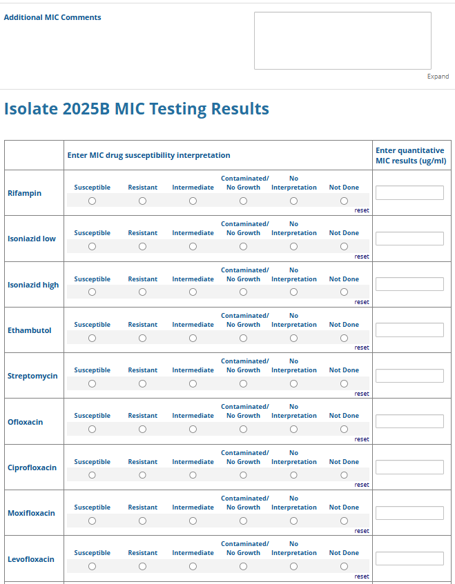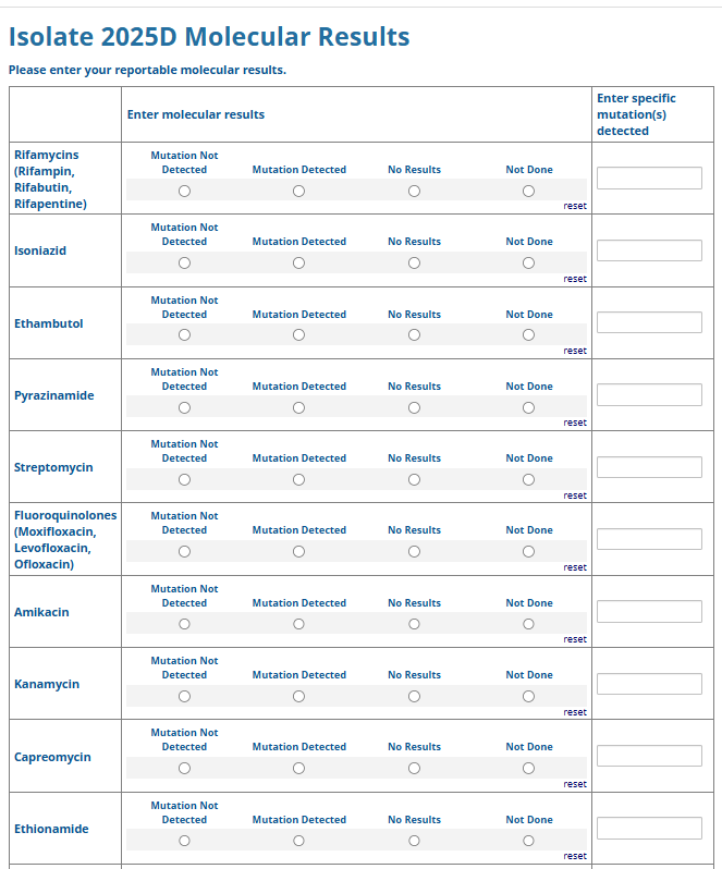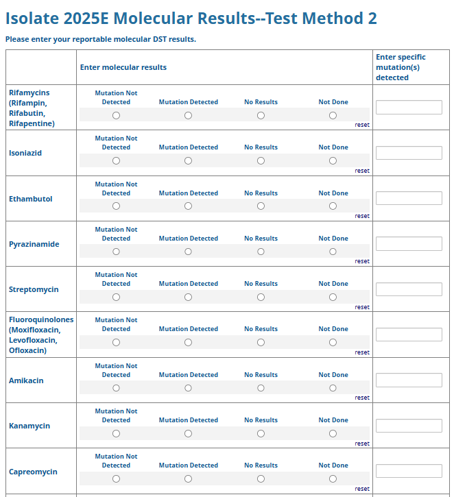 Respondents are able to submit up to two growth-based drug susceptibility testing (DST) methods and results and three molecular testing methods and results. The data collection instrument is built to include logic (a survey tool that allows a tailored question path based on respondents’ answers) to reduce burden for participating laboratories or respondents who only perform one DST method. This logic includes asking whether growth-based DST was performed (if the answer is yes, then a question is asked to determine whether a second growth-based method was performed) and whether molecular testing for drug resistance was performed (if the answer is yes, then questions are asked to determine whether a second and third molecular method was performed).