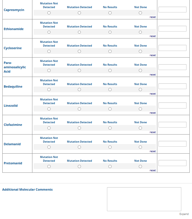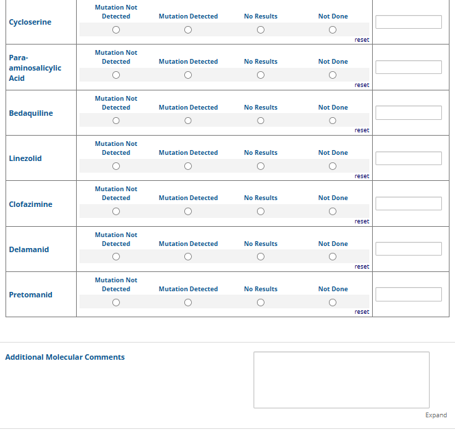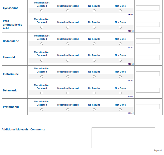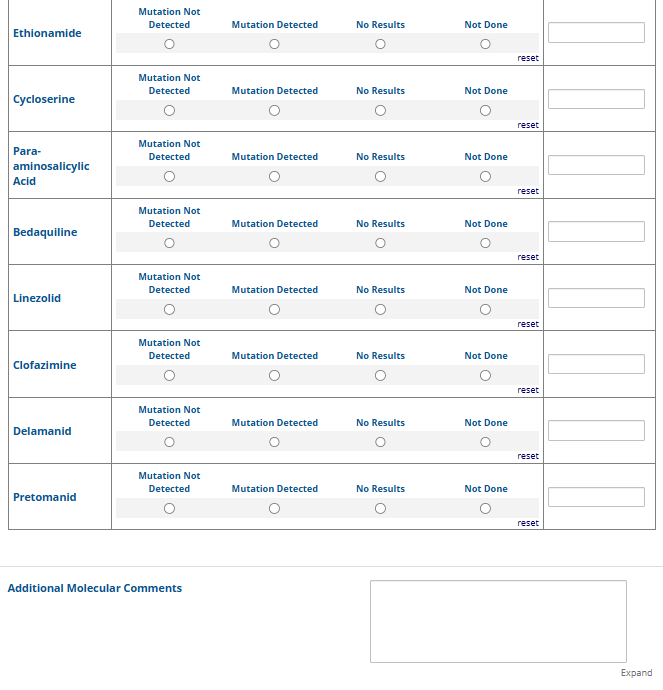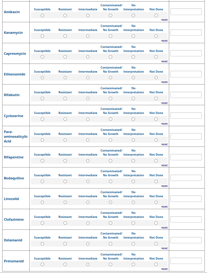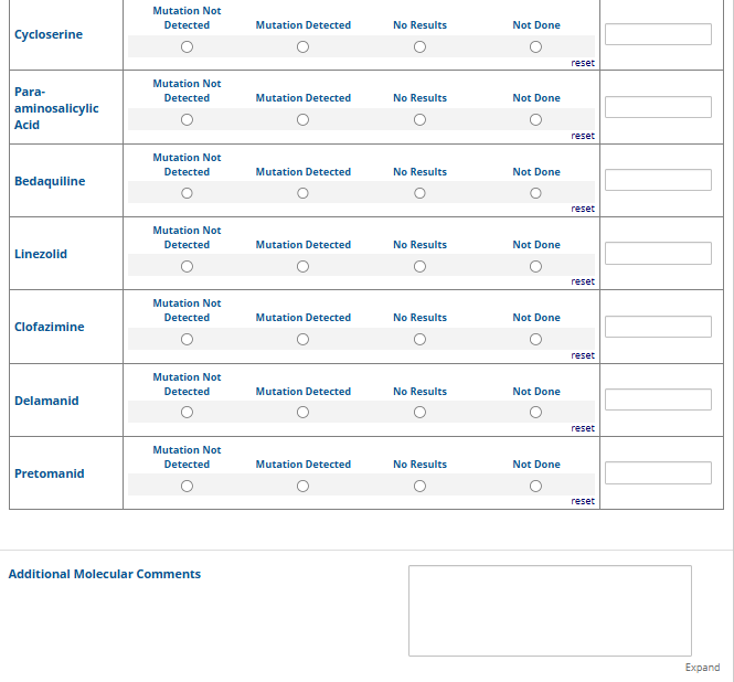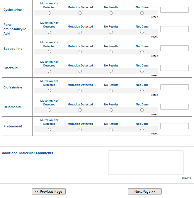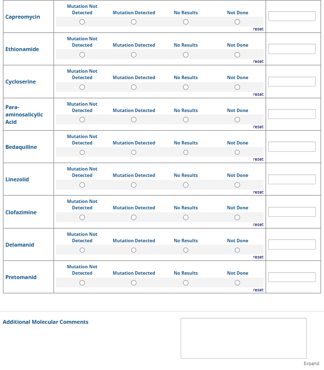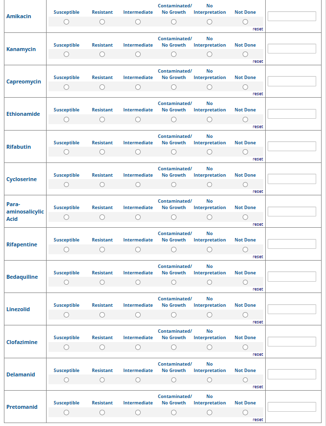 Respondents are able to submit up to two growth-based drug susceptibility testing (DST) methods and results and three molecular testing methods and results. The data collection instrument is built to include logic (a survey tool that allows a tailored question path based on respondents’ answers) to reduce burden for participating laboratories or respondents who only perform one DST method. This logic includes asking whether growth-based DST was performed (if the answer is yes, then a question is asked to determine whether a second growth-based method was performed) and whether molecular testing for drug resistance was performed (if the answer is yes, then questions are asked to determine whether a second and third molecular method was performed).