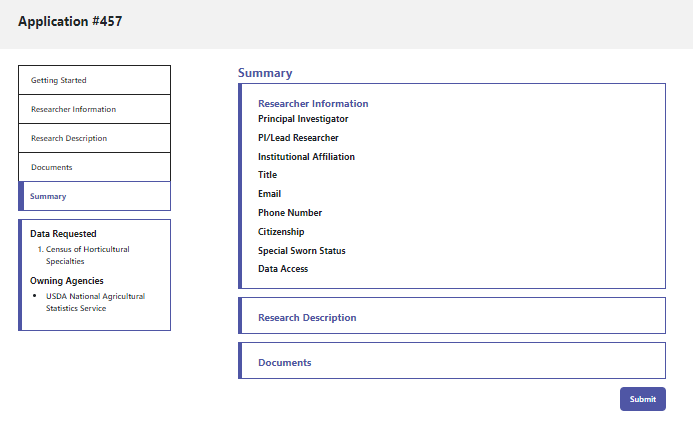 This standard application replaces the processes and forms previously used by the participating federal agencies. Your answers will be reviewed by agency staff responsible for granting access to restricted data and you may be asked to revise and resubmit to provide additional information. Finally, this is the beginning of the process of requesting access, there may be additional steps or documentation required, such as an IRB approval or signed restricted data use agreement, upon approval.