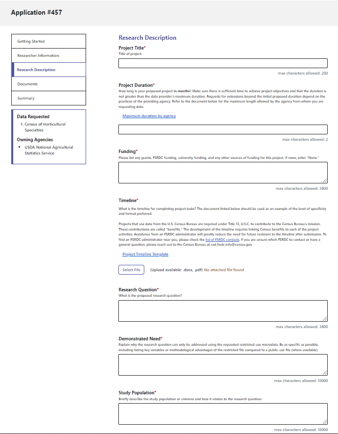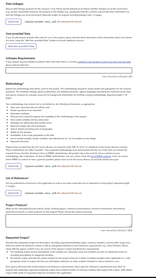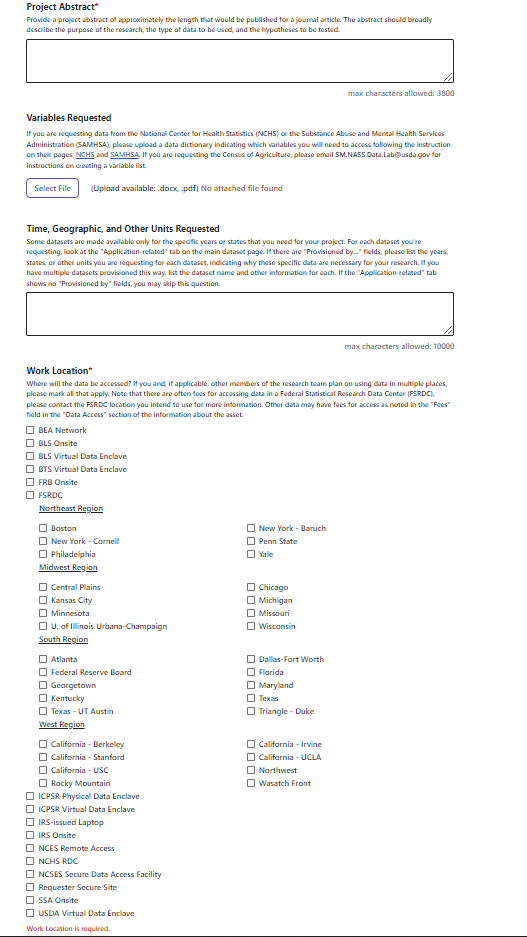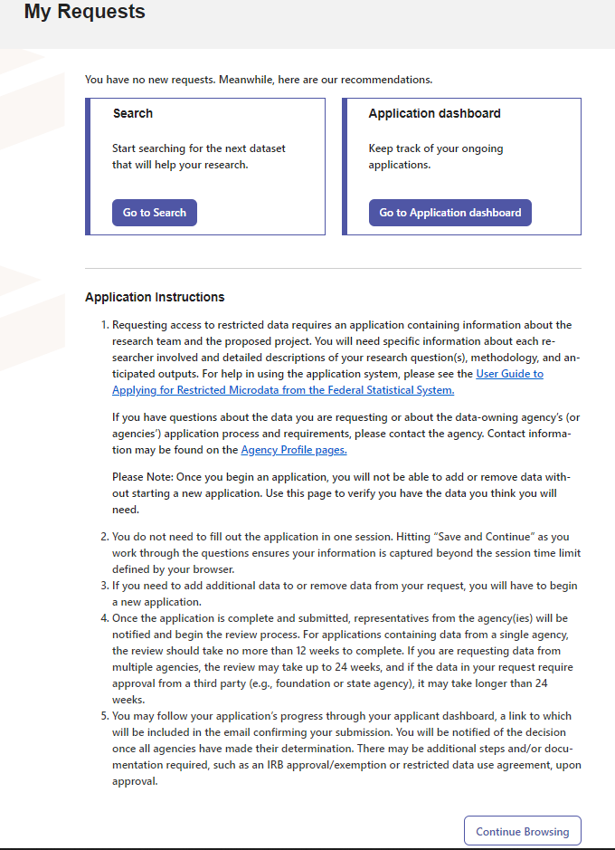 For help in using the application system, please see the User Guide to Applying for Restricted Microdata from the Federal Statistical System.