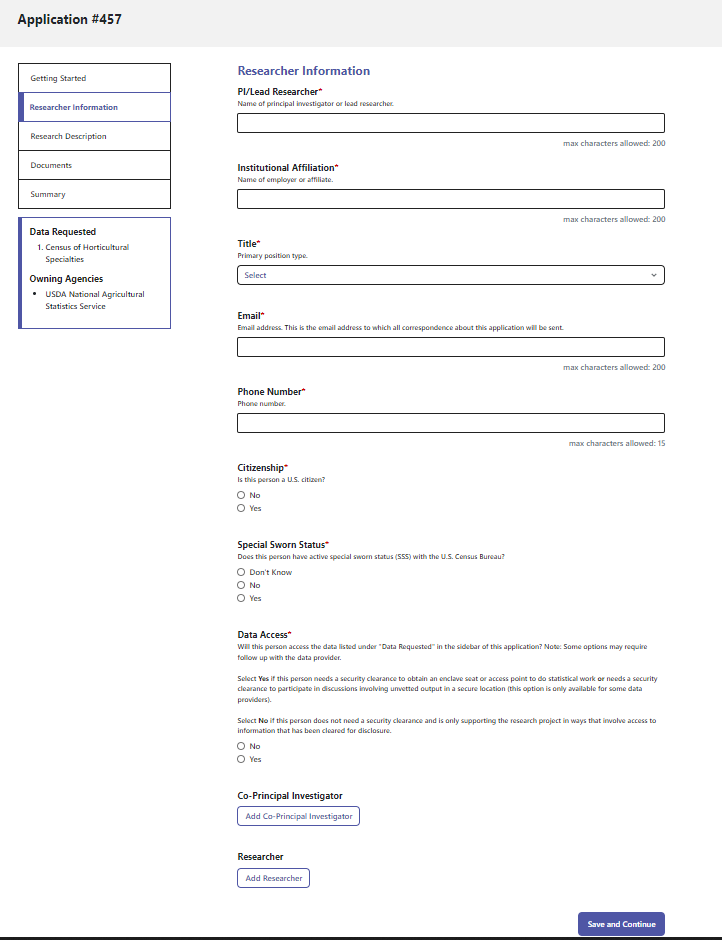 When you begin an application to request access to confidential data, you will be asked to provide identifying information at two points in the process.