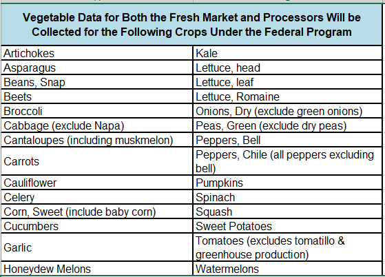The vegetable program surveys growers, who are contacted in November and asked to report acres planted and harvested, quantity of vegetables produced, and how much of their crop was sold through fresh markets or for processing along with the correlating prices.