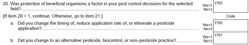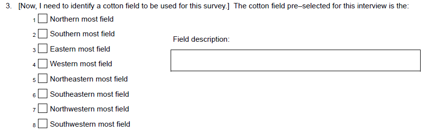 To: “Was an established scouting process such as systematic sampling, recording counts, etc. used or were insect traps used in the selected field? EXCLUDE traps checked as part of a boll weevil eradication program”