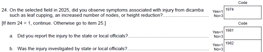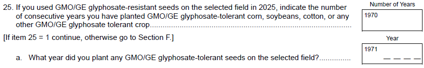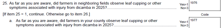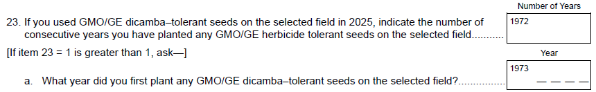 NEW Instruction – Old Question 27 & New Question 29 for columns 4-6: “After noticing the decline in the effectiveness of this herbicide in controlling weeds on the selected field, did you”