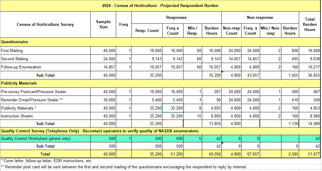 The cost to the government for the 2024 Census of Horticultural Specialties is included in the appropriation for the 2022 Census of Agriculture. The total cost of this project is estimated at $4,300,000. This amount is spent over a three fiscal year period; $500,000 the year prior to data collection, $3,300,000 for data collection and processing, and the remaining $500,000 for publication the year after data collection. The approximate cost breakdown is as follows: federal personnel, $2,700,000; NASDA field and phone enumeration $700,000; data processing $800,000; and printing, training, and other incidental costs $100,000.