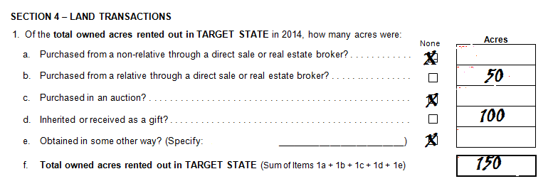 The acres in question 1a and 1b must equal the total owned acres rented out in the target state, previously recorded in section 2, question 1. Questions 2a – 2h have 2 columns that break out debt between real estate and non-real estate debt. Question 2h is the total for the questions 2a-2g. If you are unsure of the breakout, record the total in question 2h.