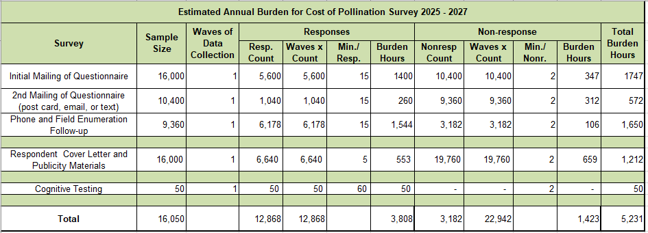 This supporting statement incorporates data and methodology from the NASS 2024 Cost of Pollination Methodology and Quality Measures Publication located at:https://www.nass.usda.gov/Publications/Methodology_and_Data_Quality/Cost_of_Pollination/01_2024/copqm24.pdf