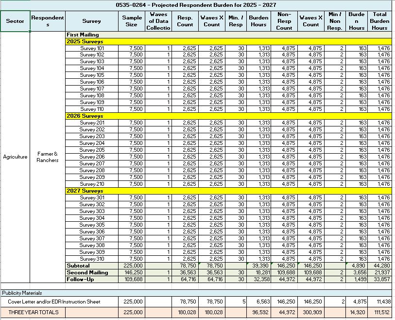 NASS uses the Bureau of Labor Statistics’ Occupational Employment Statistics (most recently published on April 3, 2024 for the previous May) to estimate an hourly wage for the burden cost. The May 2023 mean wage for bookkeepers was $23.84. The mean wage for farm managers was $43.35. The mean wage for farm supervisors was $29.23. The mean wage of the three is $32.14. To calculate the fully loaded wage rate (includes allowances for Social Security, insurance, etc.) NASS will add 33% for a total of $42.75 per hour.