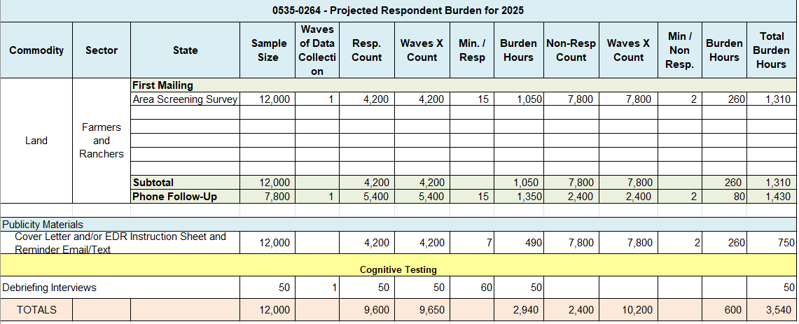 The time required to complete the 2025 Area Screening Survey is expected to average 15 minutes per respondent. Time will vary since operations differ in size, scope of production, and practices utilized. Response burden hours are shown in the table below.