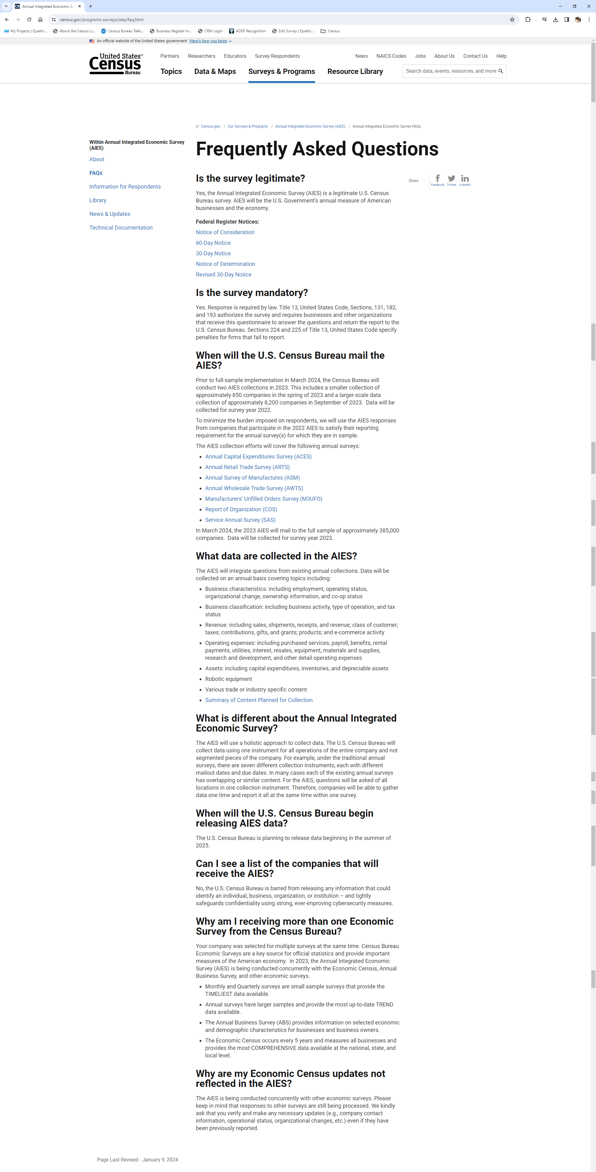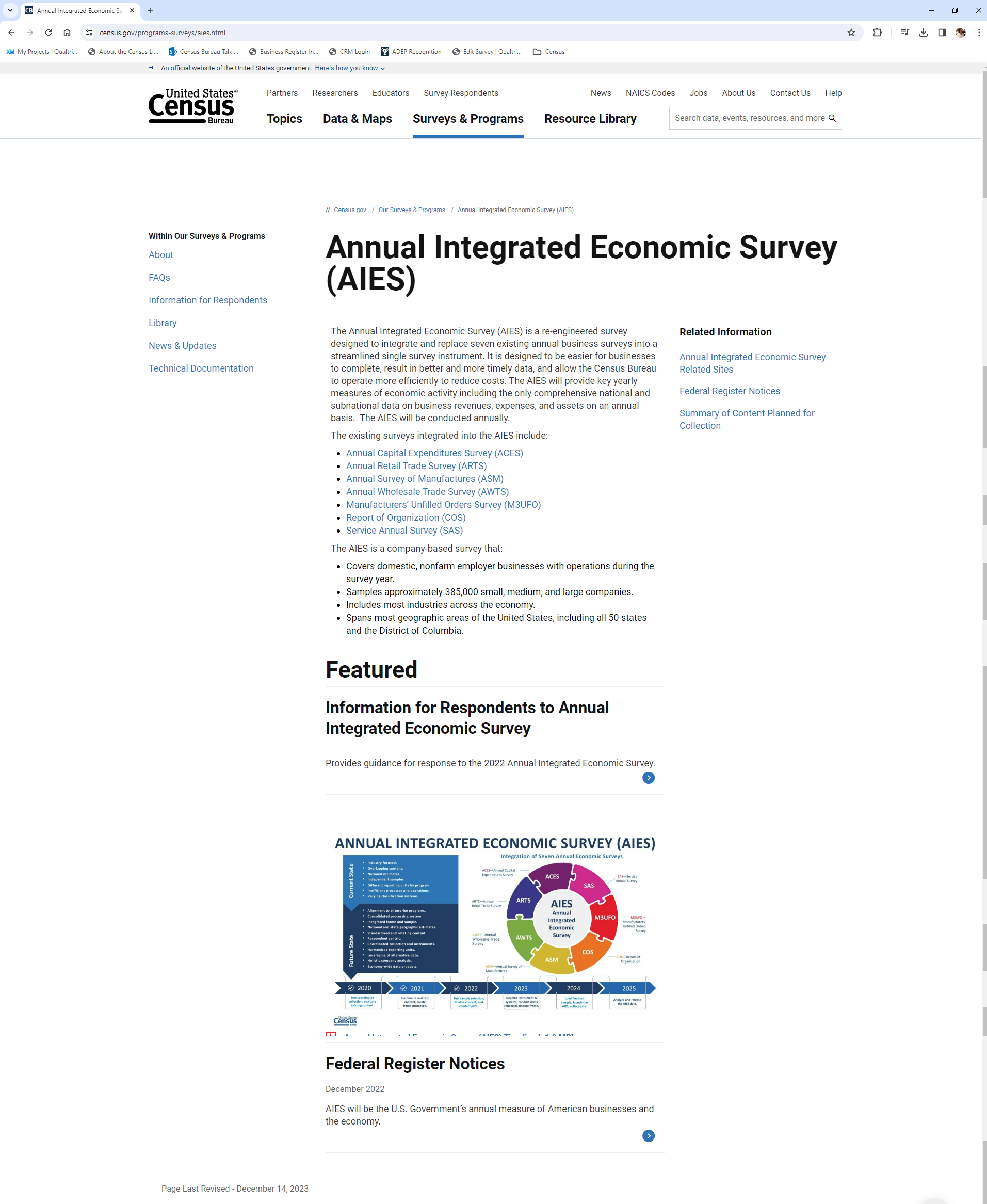 The Annual Integrated Economic Survey (AIES) is a survey re-designed to integrate and replace seven existing annual business surveys into a single streamlined instrument. The goals of the AIES redesign are to provide an easier reporting process for businesses, collect better and more timely data, and reduce costs for the U.S. Census Bureau through more efficient data collection. Designed to be conducted annually, the AIES will provide key yearly measures of economic activity, including the only comprehensive national and subnational data on business revenues, expenses, and assets.1