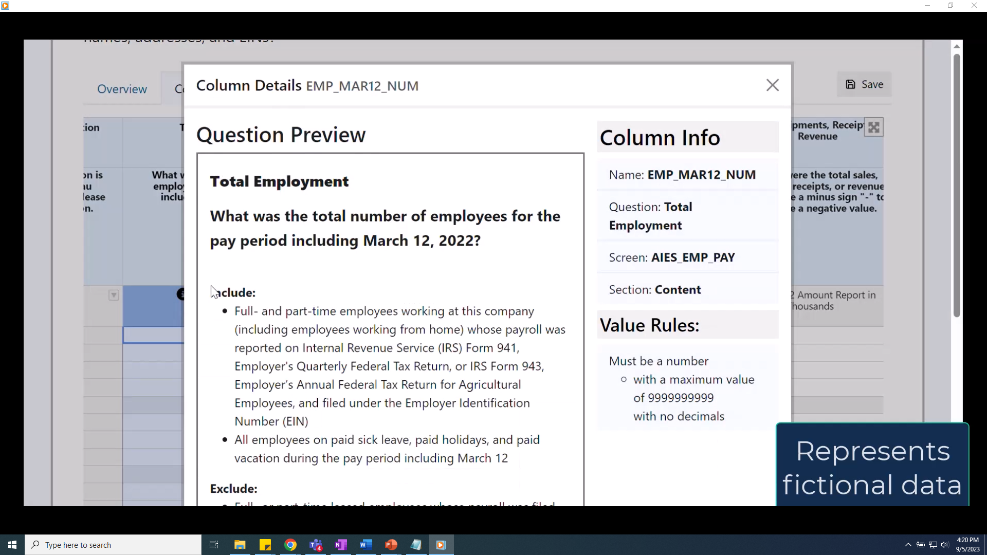 Row 4: The question text (for example: What was the annual payroll before deductions in 2022?)